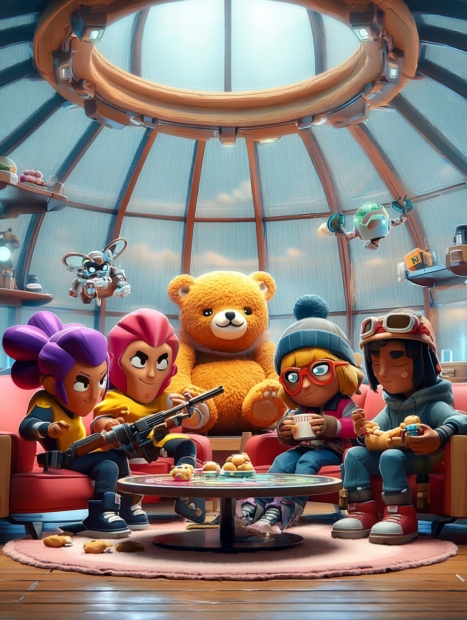 Neon çatılı arenalarda maçlar biter bitmez brawler’lar Yıldız Üssü’ne dönermiş. Cam kubbenin altında yorgun botlardan kum dökülürken, masanın üstünde sessiz bir drone vınlayarak tur atarmış. Burası, savaşçılar için dinlenme değil, düşünme yeriymiş. Takımlar burada sadece kazandıklarını değil, öğrendiklerini de paylaşırmış.