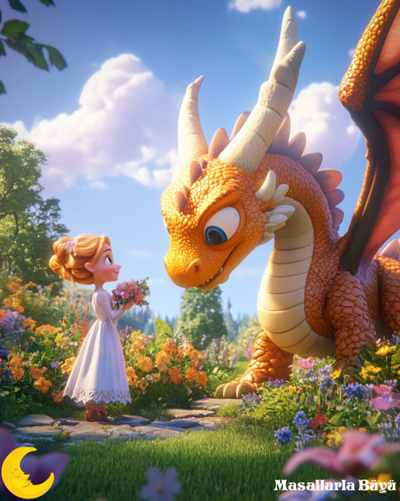 Bir gün, Elara’nın yüreği merakla dolmuş ve Cennet Bahçesi’ni görmek için içten bir istek duymuş. Cesaretini toplayarak, ejderhanın önüne çıkmış ve onunla konuşmaya başlamış. Kalbi o kadar saf ve sevgi doluymuş ki, ejderha onu tehdit etmeyi bırakıp onun yanında dostça davranmış.