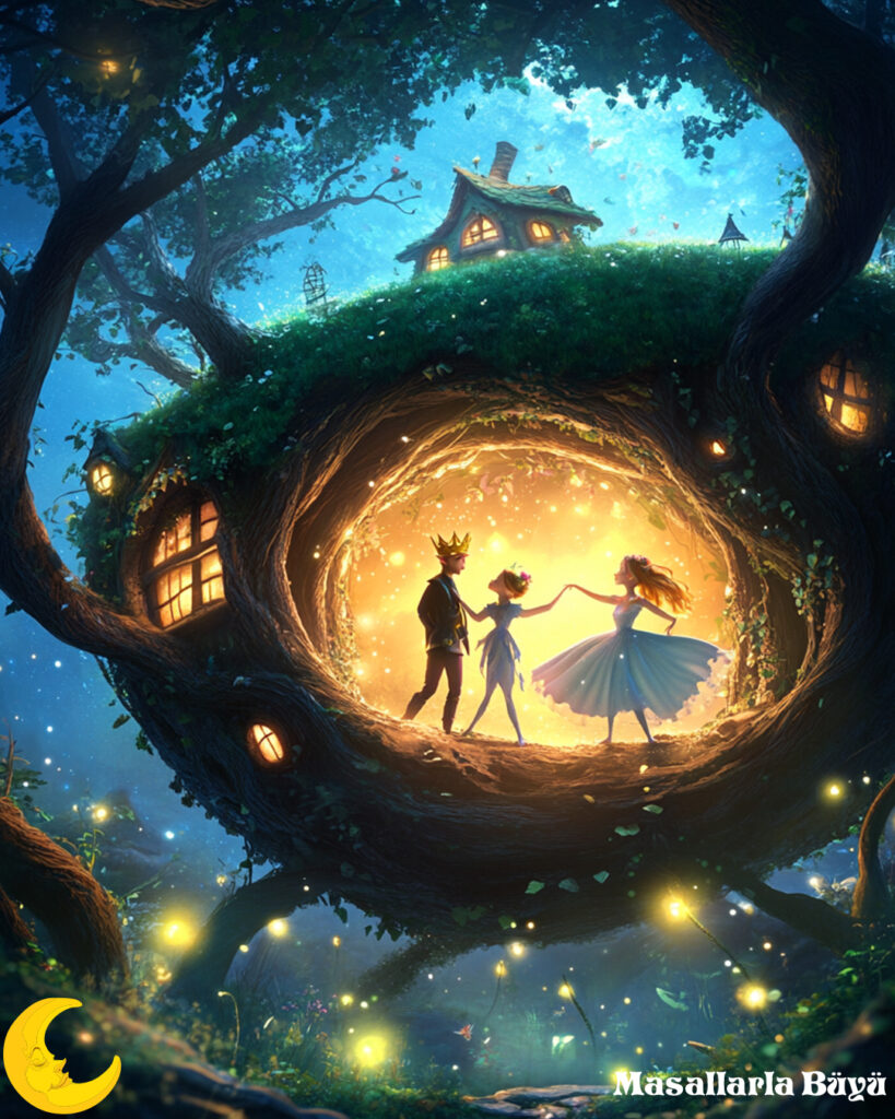 Gece ilerledikçe, saray daha da büyüleyici hale gelmiş. Müzik yükselmiş, danslar hızlanmış, neşe her yere yayılmış. Elf Kralı’nın kızları, ipekten yapılmış elbiseleriyle döne döne dans etmişler. Yemek masaları lezzetli ikramlarla donatılmış. Ormanın en tatlı meyveleri, dağların en güzel şarapları ve denizlerden gelen incelikle hazırlanmış yiyecekler sunulmuş.