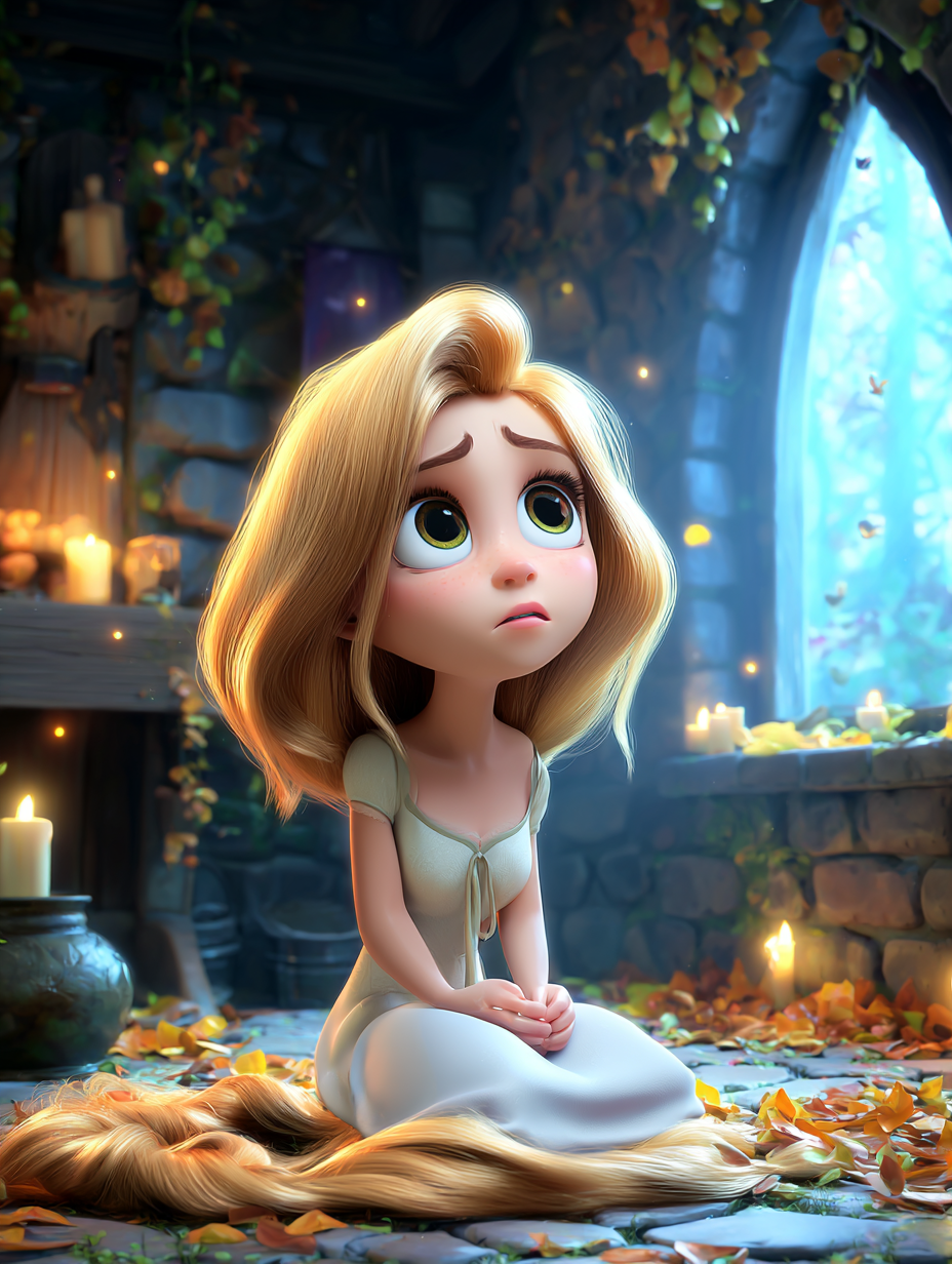 Günlerden bir gün Rapunzel yine yalnız başına kuledeymiş, kulenin minik penceresine oturmuş şarkılar söylüyor, kulenin dışındaki dünya ile alakalı birbirinden güzel hayaller kuruyormuş.