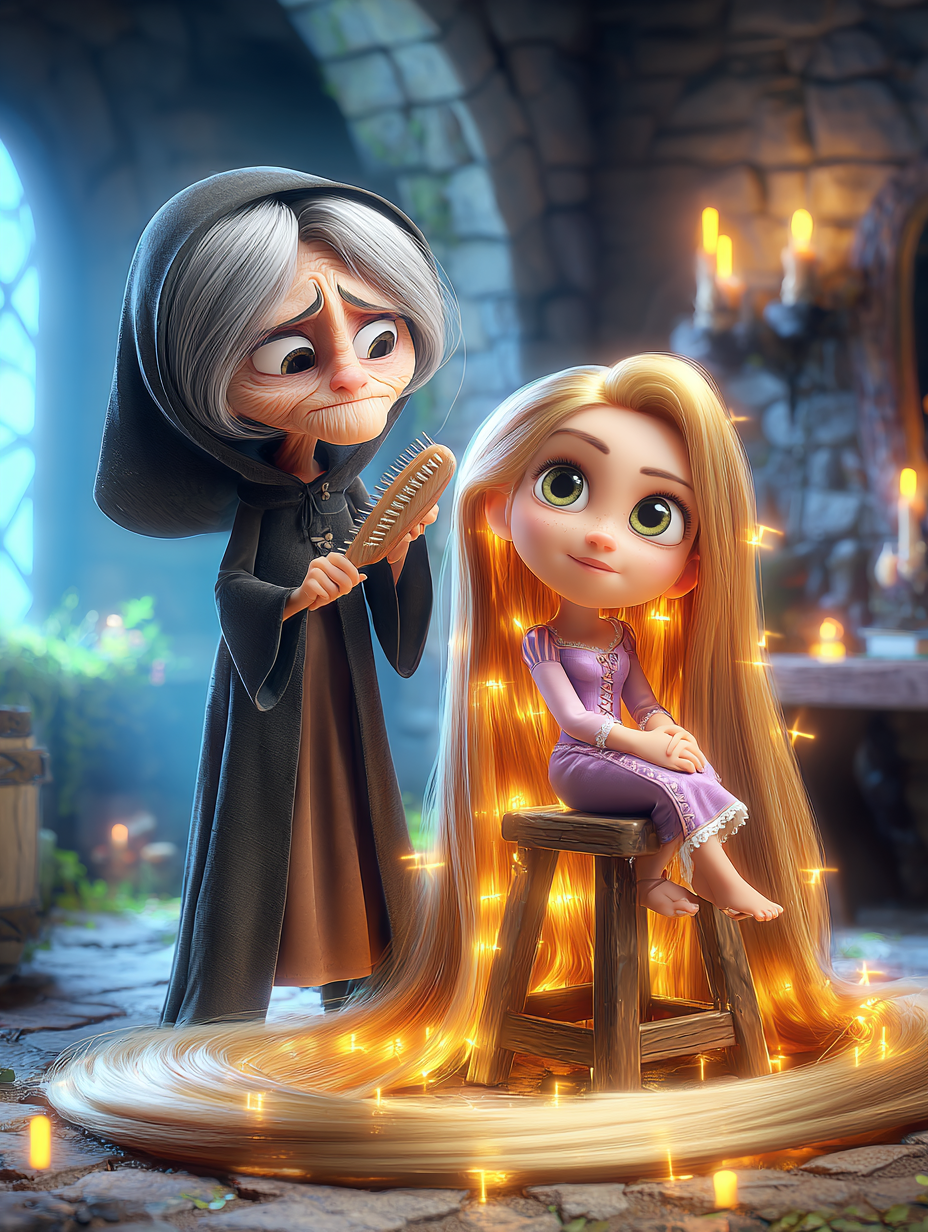 Rapunzel, her zaman olduğu gibi saçlarını kulenin tepesinden ışıl ışıl aşağı sarkıtmış. Prens oldukça heyecanlıymış, prensesin güzel saçlarına tutunarak yukarı çıkmış.