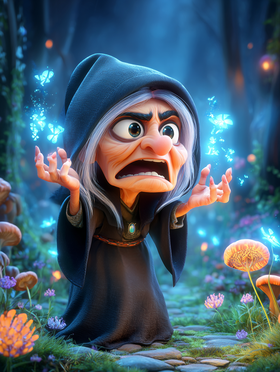 Tüm ülke kraliçenin iyileşmesine ve dünya güzeli prenseslerine sevinçle dolarken, ormanın derinliklerinde yaşayan çirkin ve yaşlı cadı, o gün yine gençleşip güzelleşmek için sihirli çiçeğini kullanmak istemiş fakat onu bulduklarını fark ettiğinde öfkeden kudurmuş.
