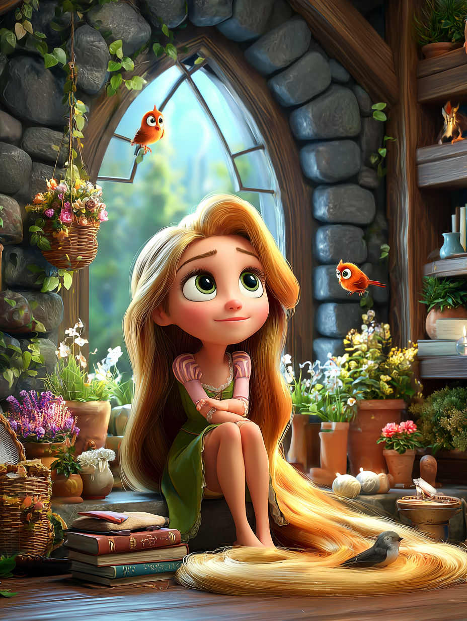 Kulenin içinde tüm gün resim yapıyor, şarkılar söylüyor hayvan dostlarıyla çeşitli oyunlar oynuyormuş. Bazen masal okuyarak zaman geçiriyormuş. Rapunzel’in en sevdiği masallardan biri Pinokyo masalıymış. Rapunzel, giriş kapısı bile olmayan bu kulede yıllar geçirmiş, büyümüş, güzelleşmiş ve tam 16 yaşına gelmiş.