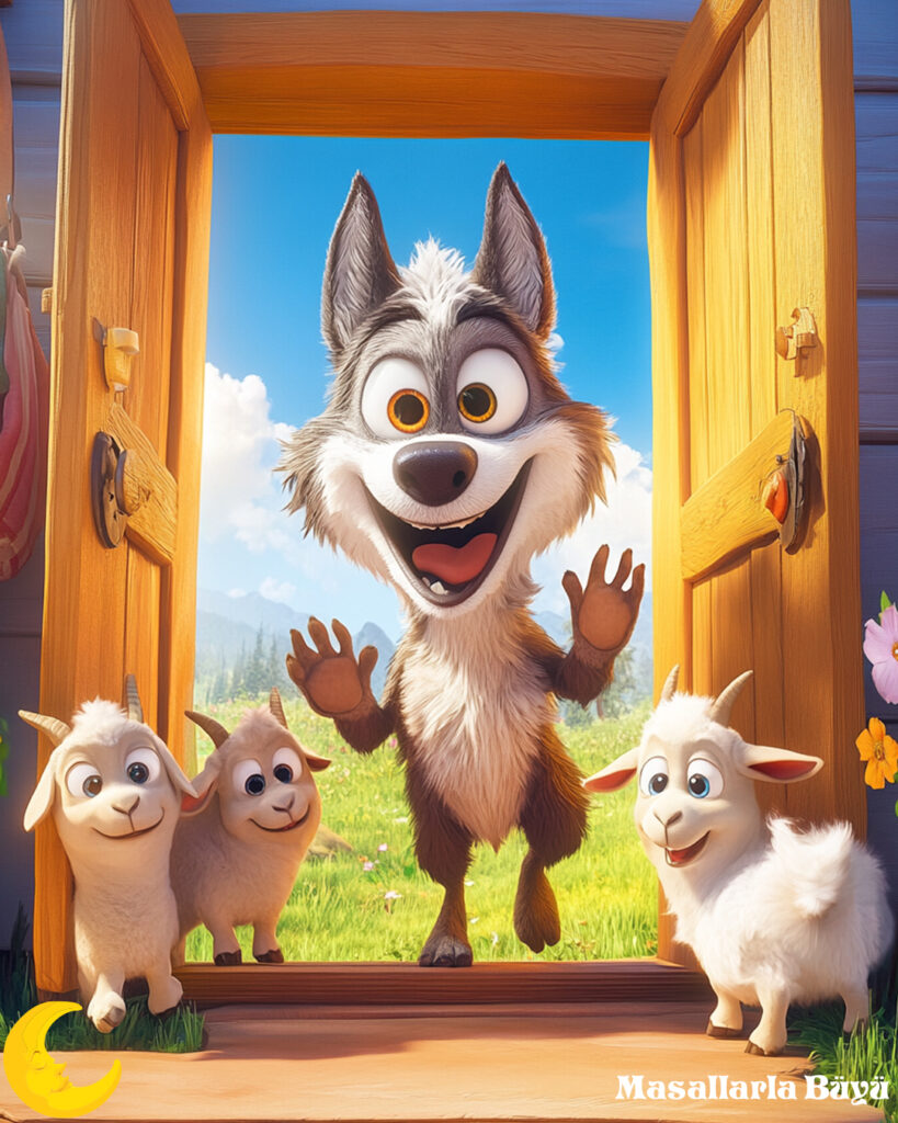 Kurt ayaklarını gösterdiğinde beyaz ayakları görmüşler ve kapıyı açmışlar. Ve ne görsünler, kurt karşılarında duruyormuş.