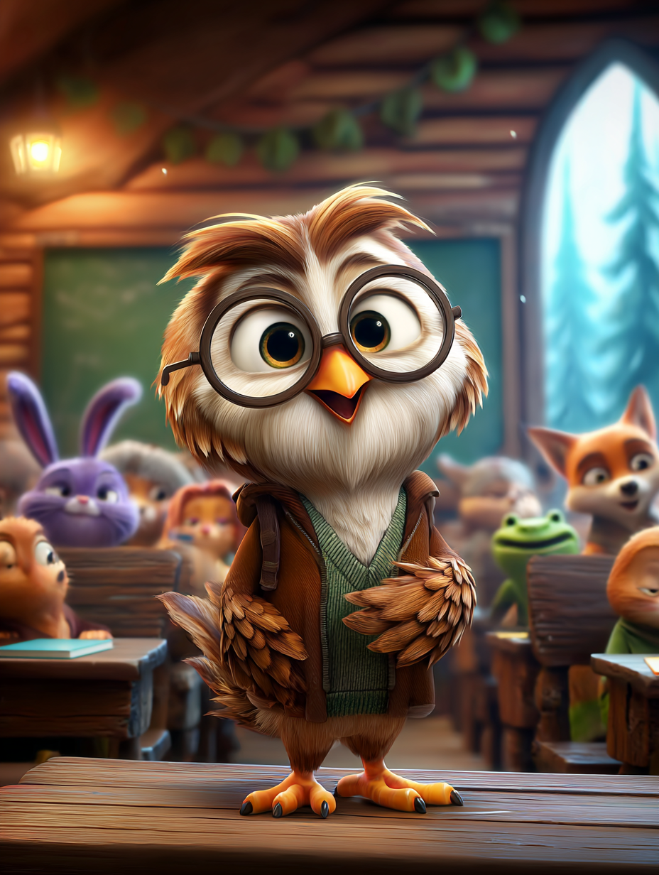 Kapıda gözlüklü, bilge Baykuş Öğretmen duruyormuş. Baykuş kanatlarını açarak gülümsemiş: