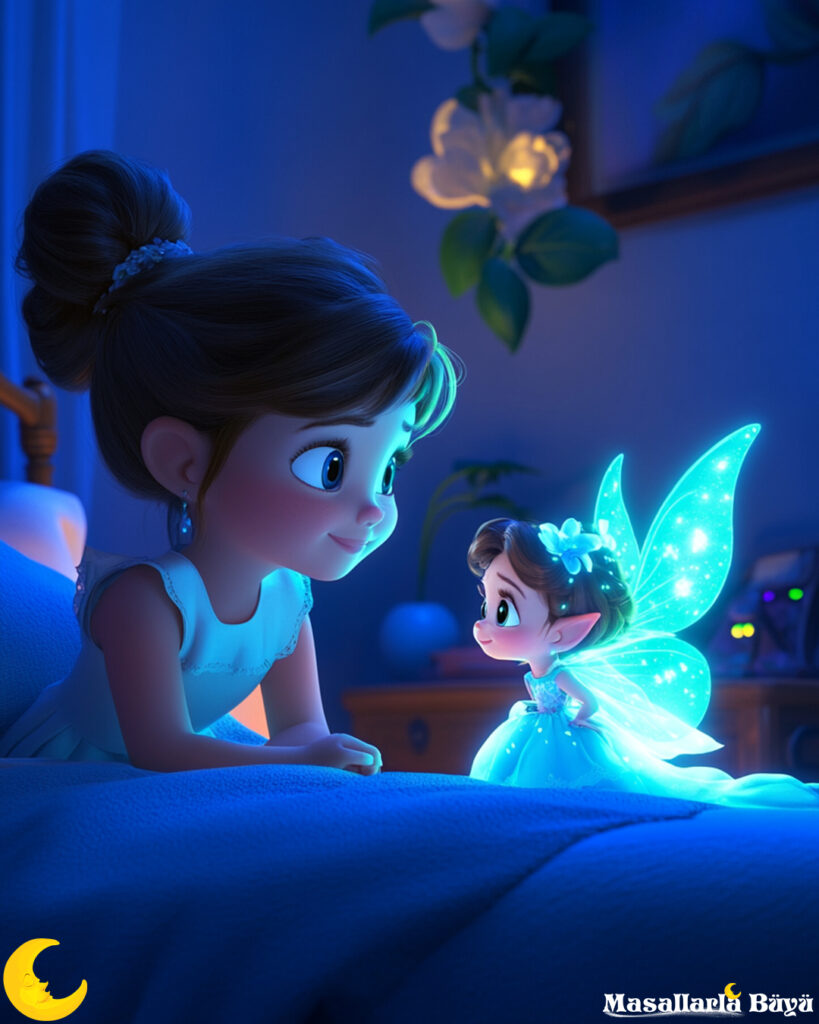 O sırada odasına süzülen harika ay ışığıyla birlikte uyku perisi hemen belirmiş. Işıl ışıl kanatları masmaviymiş.